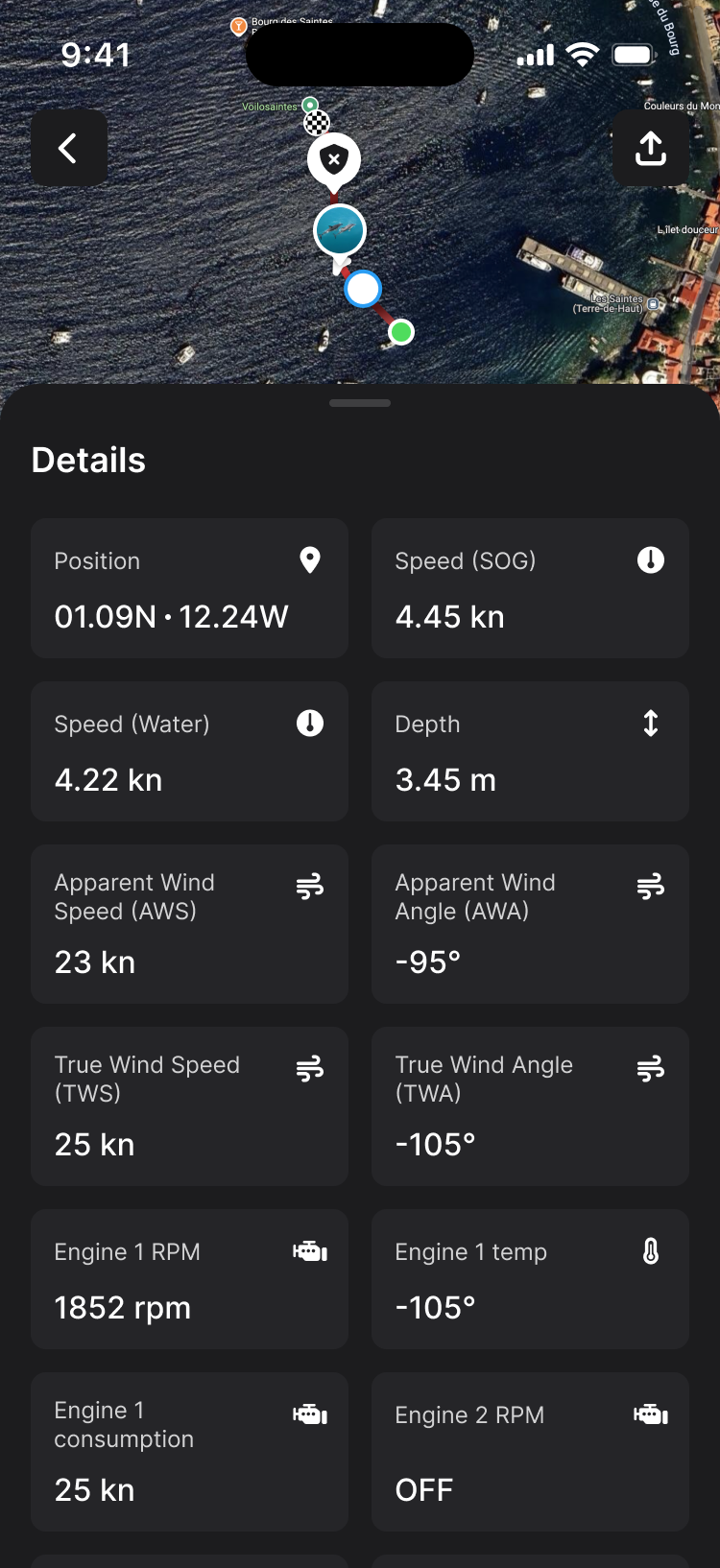 The Sailsense HUB does more than just collect and transmit data from your onboard systems to the cloud and your app it’s the brain of your boat. With powerful local computing capabilities, it can detect anomalies and trigger alerts in real time, even without an internet connection. Thanks to its embedded SIM card, it ensures seamlessglobal connectivity(2) and can receive remote updates so your system is always up to date. Compatible with NMEA2000 equipmentand equipped with analog inputs it can easily monitor most onboard systems.